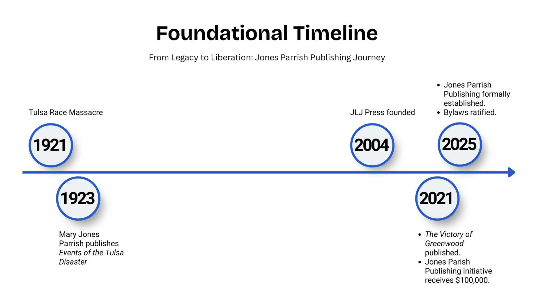 These names—Jones and Parrish—come together in our identity not by accident, but with full intention. The name Jones Parrish Publishing honors the truth, acknowledges the past, and points to a future where justice is not just remembered, but enacted. In a striking moment of poetic justice, a descendant of Mary E. Jones Parrish now serves on our inaugural board, guiding our vision and keeping us accountable to the very community Mary fought to uplift.